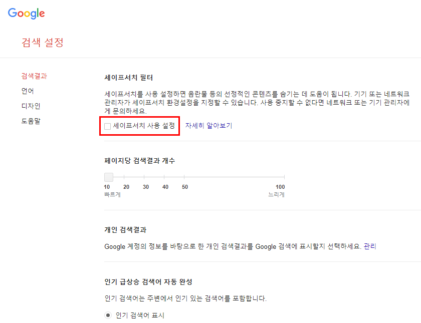 구글에서 검색을 하면 나오는 이미지가 부적절하거나 음란하다면 구글 검색 결과에 표시되지 않게 해주는 필터링 기능입니다. 이 기능은 한국에서만 강제로 시행되는 기능이라고 합니다. 우리가 구글 홈페이지에 접속을 할때 www.google.com으로로 접속을 해도 www.google.co.kr로로 접속되는 이유가 바로 구글 세이프서치 기능때문입니다.