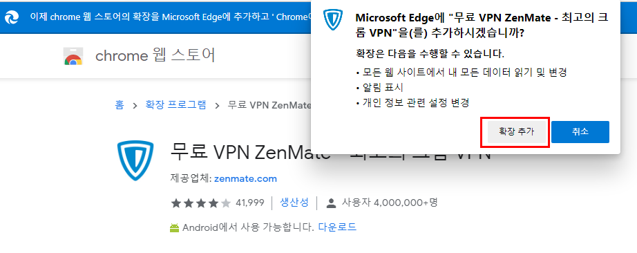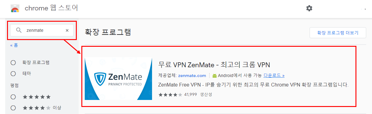 검색창에 zenmate 를 검색해주시면 확장 프로그램이 나오는데 프로그램을 설치합니다.