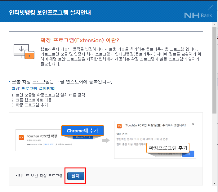그럼 아래와 같이 인터넷뱅킹 보안프로그램 설치안내가 창이 뜨는데 그럼 밑에 있는 설치를 클릭해줍니다.