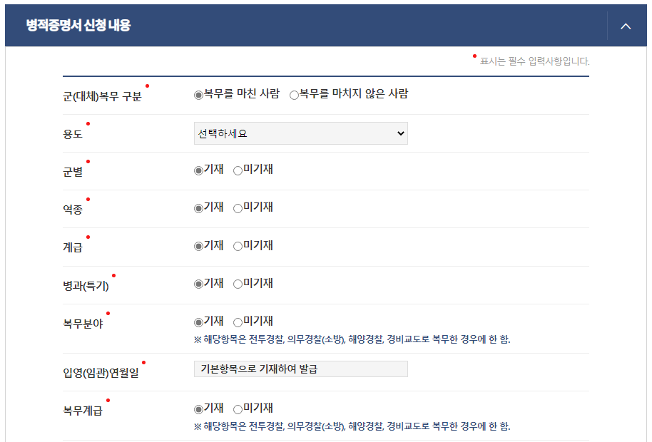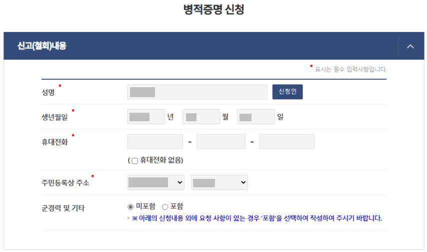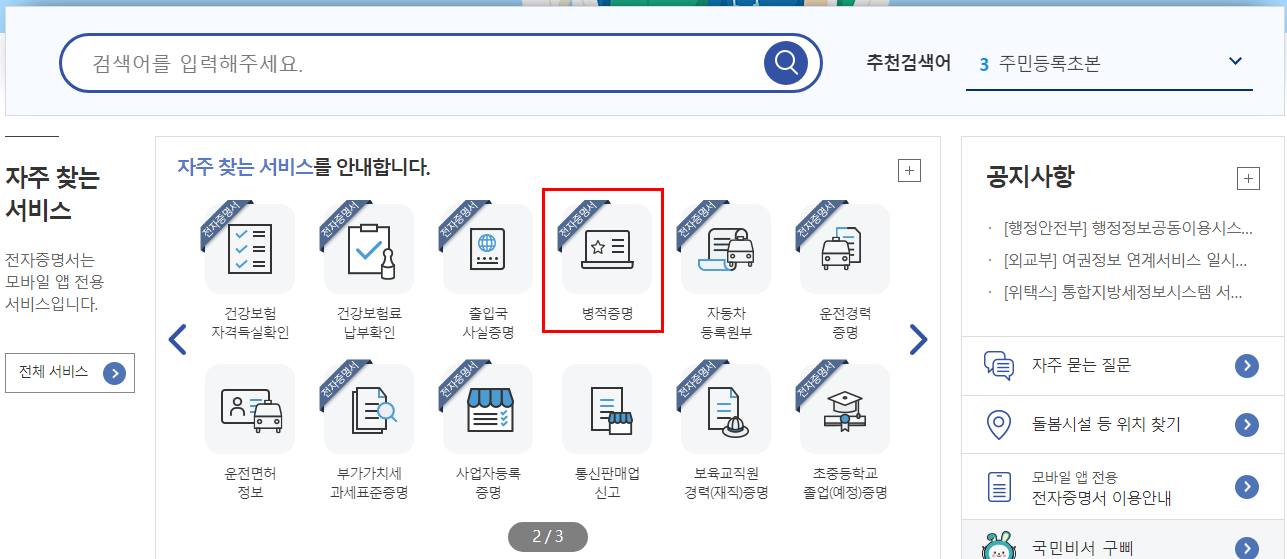 사이트 접속 후 '자주 찾는 서비스' 메뉴에서 2페이지 상단에 '병적증명' 을 클릭!!
