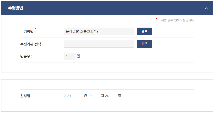 증명서 수령방법(온라인발급-본인출력,온라인열람,제3자 제출,방문수령, 수령기관선택, 발급부수를 선택하시고