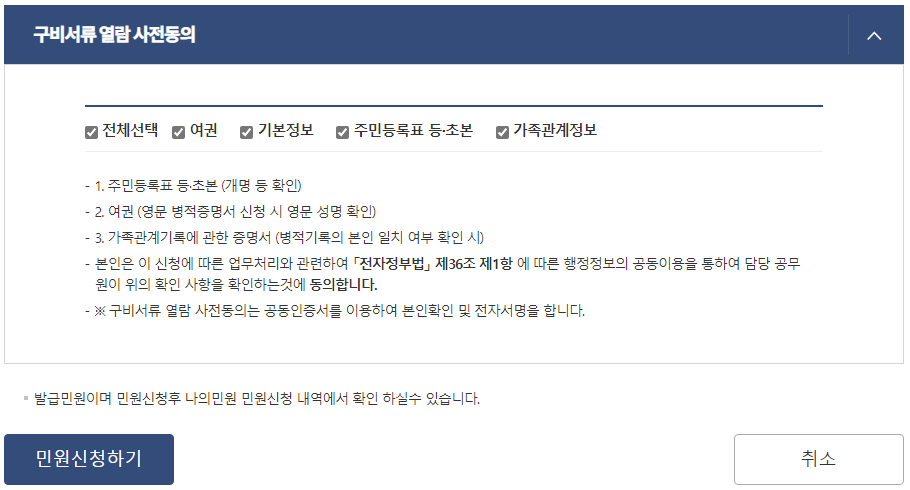 구비서류 열람 사전동의까지 해주시면 민원신청은 완료 됩니다.
