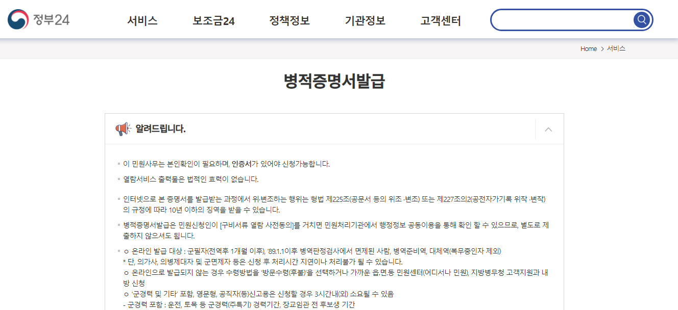 이상 정부24 사이트에서 병적증명서 인터넷 발급방법에 대해 알아보았습니다.